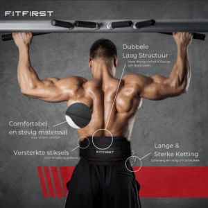 Til je training naar een hoger niveau met een dip belt. Met een dip belt van FitFirst voeg je eenvoudig extra gewicht toe aan je dips en pull-ups, waardoor je sneller progressie boekt en je kracht aanzienlijk vergroot. Onze comfortabele en veilige dip weight belt is ontworpen voor optimale prestaties zonder ongemak, zodat jij je volledig kunt focussen op je workout. Niets is namelijk zo storend als een gewichten riem die snijdt of schuurt tijdens je training. Wij bieden je een dip weight belt met een ergonomisch ontwerp, waardoor de druk gelijkmatig verdeeld wordt en de D-ringen slim gepositioneerd zijn om irritatie te voorkomen. Zo blijf je comfortabel trainen, zelfs bij zware gewichten. Wil jij meer uit je krachttraining halen? Bestel vandaag nog een dip belt bij FitFirst!