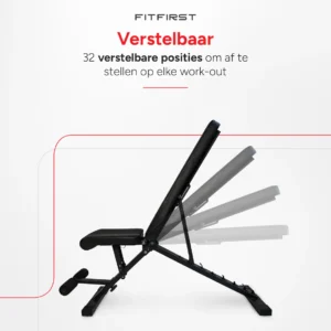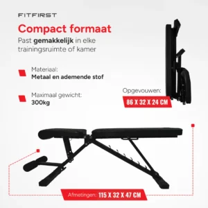 De FitFirst® Halterbank is niet zomaar een halterbank; het is de ultieme trainingspartner die jouw fitnessdoelen naar nieuwe hoogten zal brengen. Met een indrukwekkend gebruikersgewicht van maximaal 300 kg, ongeëvenaarde instelmogelijkheden, en het gemak van inklapbaarheid, is deze bank de perfecte keuze voor iedereen die serieus bezig is met fitness. Comfort, veiligheid en duurzaamheid zijn gegarandeerd, terwijl het stijlvolle ontwerp een vleugje klasse toevoegt aan jouw trainingsruimte.