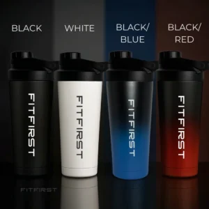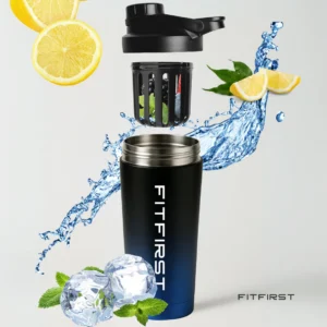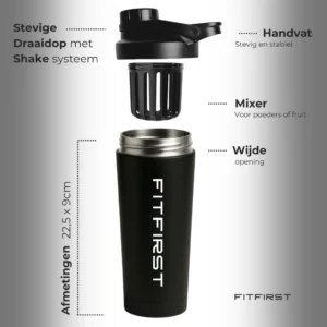 Maak je shakes lekkerder en je routine slimmer met de FitFirst Shakebeker! Deze premium shakebeker kan tot wel 750 ml bevatten en combineert topkwaliteit roestvrij staal met een innovatieve thermosfunctie die je drankjes 6 tot 8 uur warm houdt. Of je nu in de gym, op kantoor of onderweg bent, FitFirst zorgt voor een perfect gemixte shake of andere drank die altijd op de juiste temperatuur is. Ga voor duurzaamheid, stijl en gemak – kies FitFirst!